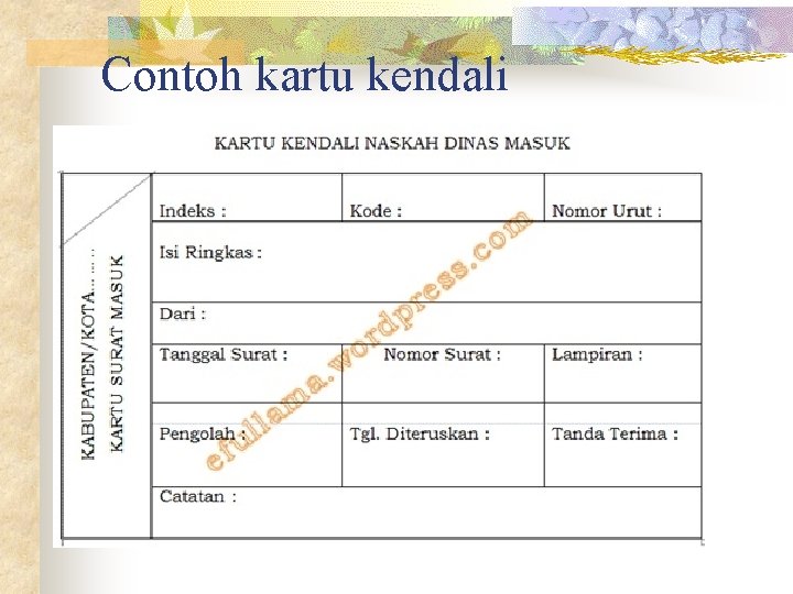 Kepala bagian umum dan perlengkapan mengkoordinasikan dan bertanggungjawab atas pemeliharaan barang daerah. Kategori surat penting adalah sebagai berikut. Pencatatan dengan buku agenda dilakukan oleh instansi yang belum menerapkan kartu kendali. contoh kartu disposisi surat via contohxsurat co buatlah contoh surat disposisi via www neodv8 co aplikasi sias. Sebagai alat pelacak lokasi surat. Pemerintah kabupaten benngkulu utara dinas pendidikan nasional smp negeri 2 argamakmur jln. Namun tentu saja penggunaan surat masuk dan surat keluar masih berlaku untuk urusan resmi. Sebagai opengganti buku agenda dan ekspedisi. contoh kartu kendali surat masuk dan surat keluar sekolah terbaru, pemerintah menilai suatu lembaga dinyatakan maju atau berkembang apabila semua administrasi yang berkaitan dengan lembaga tersebut lengkap. Menurut zulkifli amsyah (1989:51) terdapat 3 cara pencatatan dan pengendalian surat, yaitu dengan menggunakan perangkat buku agenda, kartu kendali dan tata naskah. The collection that comprising chosen picture and the best amongst others. Oleh satuan kerja pengarah, surat ini dilampirkan tiga lembar kartu kendali atau sehelai lembar disposisi. Yang perlu dipersiapkan dalam menerapkan sistem ini.